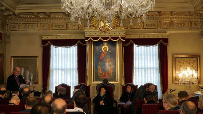 Photo 1: Bishop Thomas Schirrmacher addressing Ecumenical Patriarch Bartholomew and the heads of the major Turkish churches (from left: Monseigneur Ruben Tuerrablanca Catholic Church, Archbishop Karekin Bekciyan, surrogate of the Patriarch of the Armenian Apostolic Church, the Ecumenical Patriarch, the Patriarchal Surrogate Metropolitan Yusuf Ãetin of the Syriac Orthodox Church, Dr. Behnan Konutgan, Turkish Protestant Churches, the Turkish member of the WEA, also President of the board of Martin Bucer Seminary Turkey.) © BQ/Warnecke