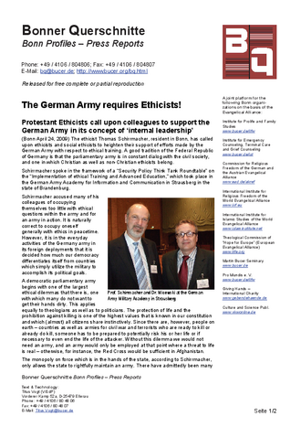 (Bonn April 24, 2009) The ethicist Thomas Schirrmacher, resident in Bonn, has called upon ethicists and social ethicists to heighten their support of efforts made by the German Army with respect to ethical training. A good tradition of the Federal Republic of Germany is that the parliamentary army is in constant dialog with the civil society, and one in which Christian as well as non-Christian ethicists belong.