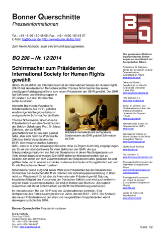 (Bonn, 25.04.2014) Der Internationale Rat der International Society for Human Rights (ISHR) hat den deutschen Menschenrechtler Thomas Schirrmacher bei seiner zweitägigen Ratstagung in Bonn zum neuen Präsidenten der ISHR gewählt. Die ISHR hat Sektionen und Arbeitsgruppen in 37 Ländern auf allen Kontinenten auÃer Australien.