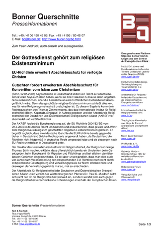 (Bonn, 02.05.2008) Asylsuchende in Deutschland sollten ein Recht auf Abschiebeschutz oder Asyl auch dann haben, wenn sie ihren Glauben zu Hause allein ungefährdet ausüben können, aber die Teilnahme an einem öffentlichen Gottesdienst lebensgefährlich wäre. Denn das geschützte religiöse Existenzminimum schlieÃt alles ein, was für eine Religionsgemeinschaft unabdingbar ist. Zu diesem Ergebnis kommt ein Rechtsgutachten von Thomas Zimmermanns, das das Internationale Institut für Religionsfreiheit (Bonn, Kapstadt, Singapur) in Auftrag gegeben und der Arbeitskreis Religionsfreiheit der Deutschen und Ãsterreichischen Evangelischen Allianz (AKREF) verabschiedet und veröffentlicht hat.