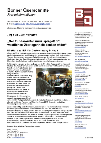 (Bonn, 04.07.2011) In einer Gastvorlesung an der gröÃten Universität in Nepal vertrat der Religionssoziologe und Direktor des Internationalen Instituts für Religionsfreiheit, Thomas Schirrmacher, unter dem Beifall Hunderter, überwiegend hinduistischer Studenten, dass der Begriff Fundamentalismus oft im Westen eingesetzt werde, um Menschen aller Religionen im Globalen Süden pauschal zu verunglimpfen.