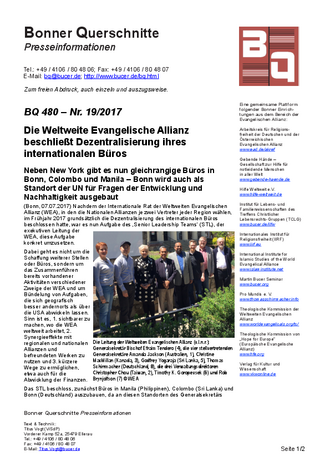 Im Falle von Bonn werden das Büro der Theologischen Kommission, das Büro für zwischenkirchliche Beziehungen und interreligiösen Dialog sowie die Büros des International Institute for Islamic Studies und des International Institute for Religious Freedom zusammengeführt. Dazu werden weitere Aktivitäten im Umfeld der WEA, sofern sie in Europa, im Nahen Osten und Zentralasien stattfinden, aufgefordert, von Bonn aus zu operieren. Mehrere Arbeitszweige haben bereist positiv darauf reagiert, so die Business Coalition und die Abteilung für âPeace and Reconciliationâ, die ihre geplante Stiftung (Stifter erwünscht!) in Bonn ansiedeln will.