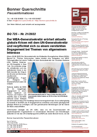 (Bonn, 03.06.2022) Der Generalsekretär der Weltweiten Evangelischen Allianz (WEA), Bischof Dr. Thomas Schirrmacher, leitete kürzlich eine Delegation von WEA-Führungskräften bei einem Treffen mit dem Generalsekretär der Vereinten Nationen (UN), António Guterres, am UN-Hauptsitz in New York. Sie erörterten einige der anhaltenden und neu auftretenden Krisen in der Welt, darunter der Krieg in der Ukraine und die daraus resultierende Flüchtlingskrise, Fragen der Religions- und Glaubensfreiheit sowie die Umwelt.