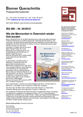 (Bonn, 26.06.2015) Am 10.10.2010 beschloss die zum Bund der Mennonitischen Freikirche Ãsterreichs (kurz MFÃ) gehörende Friedensgemeinde Salzburg, sich aufzulösen. Die Arbeit des kleinsten österreichischen Bundes erreichte damit ihren Tiefstpunkt. Der Bund war binnen 10 Jahren von 8 auf 5 Gemeinden geschrumpft. Stimmen wurden laut, den Bund aufzulösen. Zu dieser Zeit war der Autor Martin Podobri Pastor der Linzer Gemeinde. Kurz darauf wurde er zum Bundessekretär der MFà berufen. In weiterer Folge kam es zur Neuausrichtung der MFÃ, sodass wieder neues Leben bei den Mennoniten einkehrte.