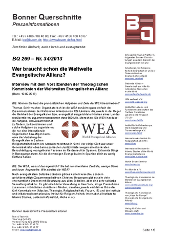 Kurzum: Der einzige wirkliche Zusammenhalt der WEA ist das Evangelium von Jesus Christus, die Ãberzeugung, dass Glaube eine persönliche und aktive Angelegenheit ist und die zentrale Stellung der Bibel. Wo wir uns auf dieser Basis einigen, können wir in der enormen Bandbreite von 600 Mio. etwas bewirken. Für AuÃenstehende mag das nicht nach Einfluss aussehen, aber ich glaube, der Papst würde sich manchmal freuen, wenn er so viel Einfluss auf die Basis seiner Kirche hätte.