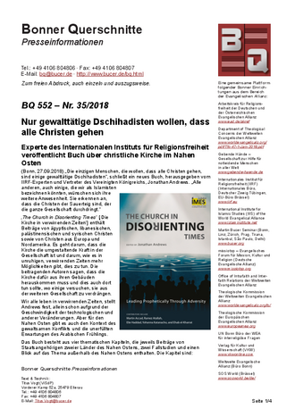 (Bonn, 27.09.2018) âDie einzigen Menschen, die wollen, dass alle Christen gehen, sind einige gewalttätige Dschihadistenâ, schlieÃt ein neues Buch, herausgegeben vom IIRF-Experten und Vertreter des Vereinigten Königreichs, Jonathan Andrews. âAlle anderen, auch einige, die wir als Islamisten bezeichnen könnten, wünschen sich ihre weitere Anwesenheit. Sie erkennen an, dass die Christen der Sauerteig sind, der die ganze Gesellschaft durchdringt.â