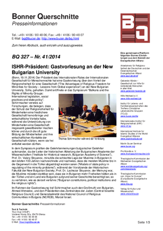 (Bonn, 19.11.2014) Der Präsident des Internationalen Rates der Internationalen Gesellschaft für Menschenrechte hat eine Gastvorlesung über den Vorteil der Religionsfreiheit für eine Gesellschaft (âThe Advantages of Religious Freedom for Minorities for Society â Lessons from Global experienceâ) an der New Bulgarian University, Sofia, gehalten. Damit eröffnete er das Symposium âBalkans and the Rights of Minority Groups: International legislation, social practices and state policyâ. Schirrmacher verwies auf Forschungen, die belegen, dass der Schutz der Religionsfreiheit für Minderheiten eine friedlichere Gesellschaft hervorbringe und wirtschaftliche Vorteile habe, während die Unterdrückung von Minderheiten eine Gesellschaft insgesamt gewaltbereiter machen könne und durch die oft gute Bildung der Minderheiten und ihre wirtschaftlichen Kontakte der Gesellschaft nützten, wenn sie frei entfaltet werden dürften.