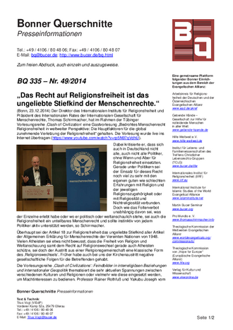 (Bonn, 23.12.2014) Der Direktor des Internationalen Instituts für Religionsfreiheit und Präsident des Internationalen Rates der Internationalen Gesellschaft für Menschenrechte, Thomas Schirrmacher, hat im Rahmen der Tübinger Vorlesungsreihe âClash of Civilizationâ eine Gastvorlesung âBedrohtes Menschenrecht Religionsfreiheit in weltweiter Perspektive: Die Hauptfaktoren für die global zunehmende Verletzung der Religionsfreiheitâ gehalten. Die Vorlesung wurde live ins Internet übertragen (