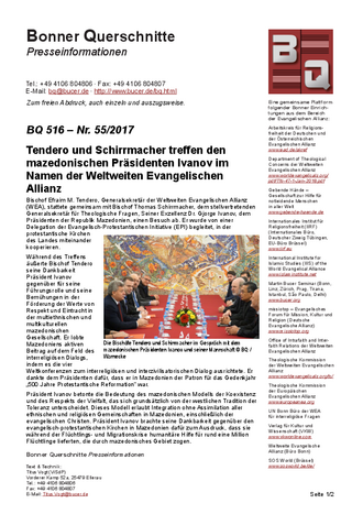 Während des Treffens äuÃerte Bischof Tendero seine Dankbarkeit Präsident Ivanov gegenüber für seine Führungsrolle und seine Bemühungen in der Förderung der Werte von Respekt und Eintracht in der multiethnischen und multikulturellen mazedonischen Gesellschaft. Er lobte Mazedoniens aktiven Beitrag auf dem Feld des interreligiösen Dialogs, indem es die vier Weltkonferenzen zum interreligiösen und interzivilisatorischen Dialog ausrichtete. Er dankte dem Präsidenten dafür, dass er in Mazedonien der Patron für das Gedenkjahr â500 Jahre Protestantische Reformationâ war.
